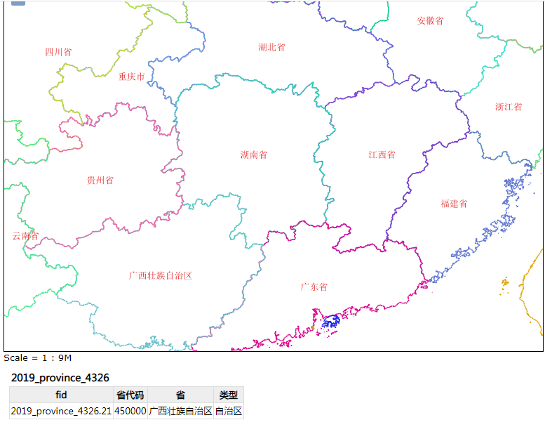 按照第一章节的样式详解介绍,这里将完成矢量瓦片的样式具体定义。这里的演示数据是全国各省份、自治区、直辖市的矢量数据。空间信息如下: