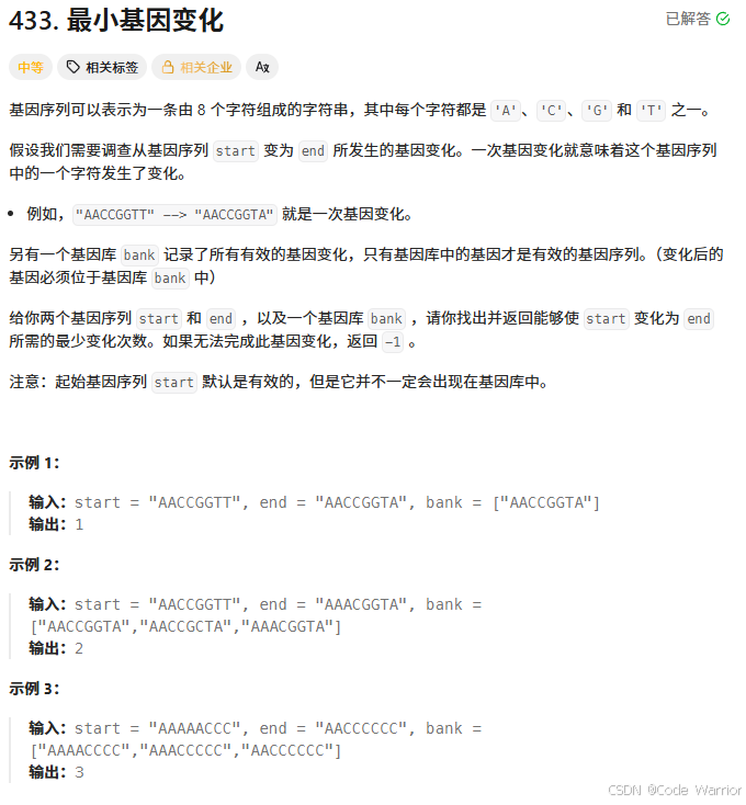 startGene出发,每次只能变异一个字符,求变为目标基因endGene的最少变异次数。 - 合法变异条件:每次变异后的新基因必须存在于基因库