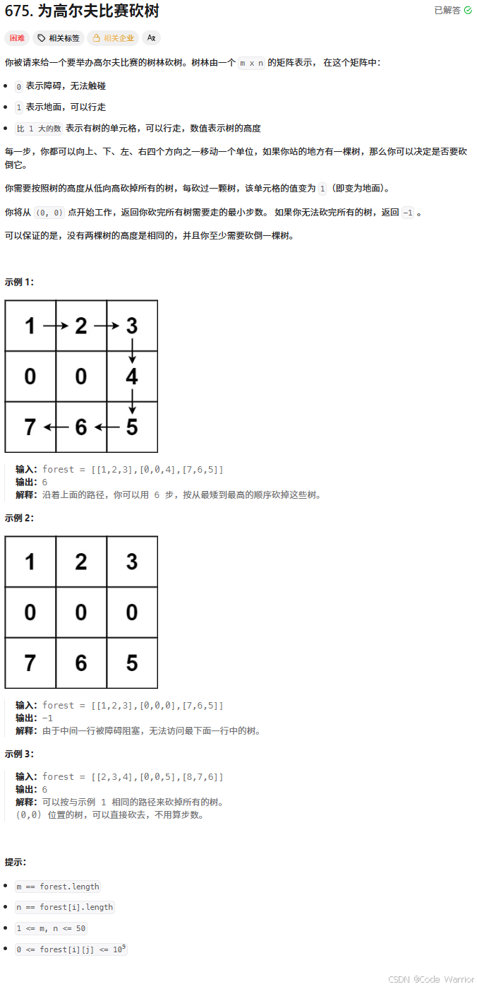 forest[0][0] == 0(起点是障碍),直接返回-1。 - 循环砍伐:从堆中依次取出最矮树,调用 BFS 计算当前位置到目标树的步数,累加总步数