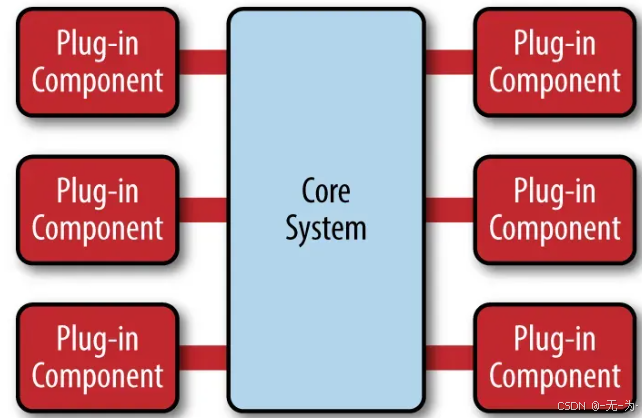 这种模式适用于需要适应不断变化的系统需求的应用。它分为扩展功能(插件Plugins)和最小功能核心。核心系统包括标准的业务逻辑,而插件则是独立的组件,通过自定义代码为核心系统提供特定的处理功能。