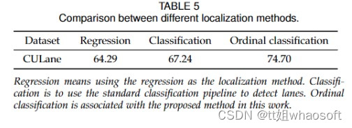 我们的方法将车道检测定义为一个有序分类问题。一个很自然的问题是,与其他方法如回归和常规分类相比如何呢? 对于回归方法,我们用一个相似的回归头替换管道中的分类器头。training loss替换为Smooth L1 loss。对于传统的分类方法,我们使用与流水线中相同的分类器头。分类与有序分类的区别在于损失和后处理。