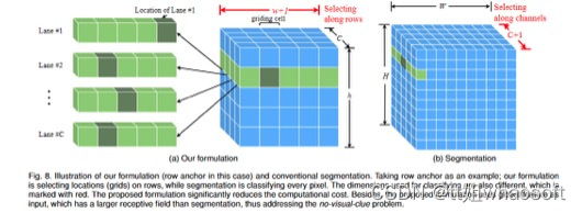 在这一节中,我们首先分析了我们的方法的复杂度,并给出了我们的方法能够实现超高速的原因。为了分析复杂度,我们使用分割作为基准。我们的公式(以行锚为例)和分割的差异如图8所示。可以看出,我们的范式比常用的分割要简单得多。假设图像大小为。由于分割是像素分类,所以需要进行分类。对于我们的方法,包含混合锚上车道线的坐标的学习目标T的长度为 。因为我们只需要少量锚点来表示车道线,则, 。和车道分别为行锚和列锚的车道数,这和其他变量相比是很小的。这样,我们有:
