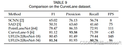 对于CurveLanes数据集,我们在表9中显示了结果。我们可以看到,与CurveLane-S方法相比,我们的方法在保持更快速度的同时取得了更好的性能。