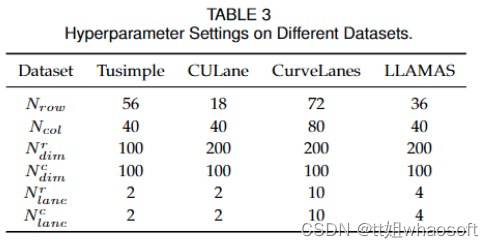 超参数设置如表3所示。关于锚数量和类别维度的消融研究分别见4.2.4节和4.2.5节。在优化过程中,CULane和TuSimple上的图片大小分别调整为1600×320和800×320。式10中的损失函数系数α和β分别设为0.05和1。batch size设置为每个GPU 16个,所有数据集的训练epoch总数设置为30个。使用SGD优化器,学习率被设置为0.1,并在第25个epoch降低10倍。所有模型均使用PyTorch[60]和Nvidia RTX 3090 gpu进行训练和测试。