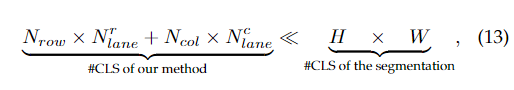 其中#CLS表示“分类数量”.以CULane数据集的设置为例,我们有。我们的方法的分类数为118,而分割的分类数为。考虑到分类维度,我们的方法的理想计算数为,而分割的理想计算数为。我们的分类头和分割头使用ERFNet的计算代价分别为和。