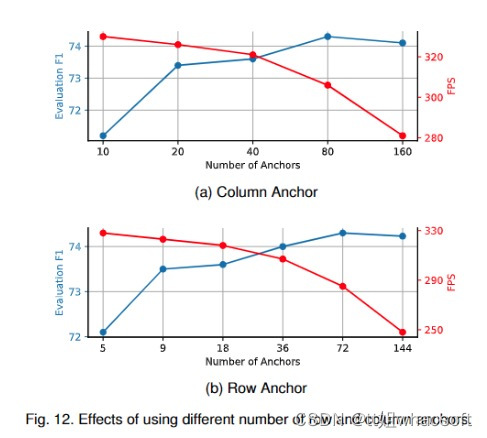 在我们的方法中还有另一个重要的超参数:用于表示车道的锚点数量(和)。这样,我们将行锚定的数量设置为18,并将列锚定的数量设置为10、20、40、80和160进行实验。结果如图12a所示。然后,我们将设为40,并将设为5、9、18、36和72进行实验。结果如图12b所示。