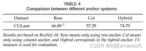 为了验证混合锚系统的有效性,我们在CULane上进行了三个实验。结果如表4所示。