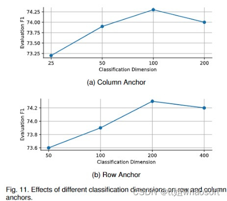 如Eq. 4所示,我们使用基于分类的范式来检测车道线,不同的车道线位置用不同的类别表示。这就产生了一个问题,需要多少类来进行车道线检测。为了讨论这个问题,我们首先设置行锚的分类维数为200,列锚的分类维数为25、50、100、200进行实验。结果如图11a所示。然后,我们将设定为100,并在为50、100、200、400时进行实验。结果如图11b所示。我们可以看到,随着分类维度的增加,性能呈现先增加后降低的趋势。维度越小,分类就越容易,但每个类代表的位置范围就越大,即每个类的定位能力就越差。维度越大,每个类代表的位置范围就越窄(每个类的本地化能力就更好),但是分类本身就更难。最终的性能是分类难度和每个类的定位能力之间的权衡。所以我们设置为100,为200。