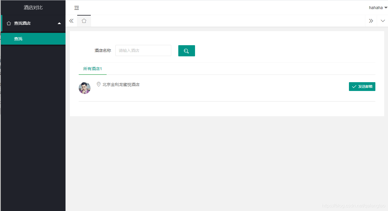 简介系统的主要是目的是对比去哪喝携程的酒店价格,星级等信息。首先是是使用爬虫,爬取了北京同一地点附近的酒店信息,大约几百条,爬虫也在代码中,爬虫使用的是selenuim这种方式,简单直接爬取到的信息存储在sqlite数据中,其实也可以修改为在mysql中使用django搭建的网站页面,读取数据库中的酒店信息提供了搜索功能,搜索到去哪喝携程都有的酒店,可以点击发送到邮箱,这样就可以发送邮件到注册用户