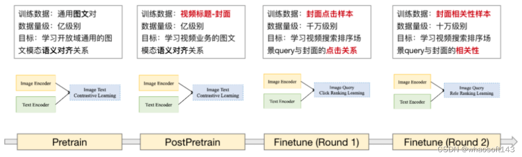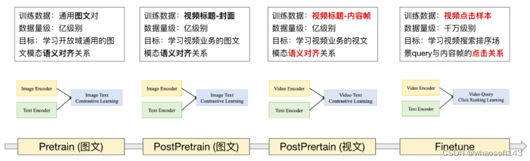 在基于图文 PostPretrain 的模型基础上,引入了在业务数据上针对视文匹配的多阶段训练,实现模型效果更好的适配业务场景。