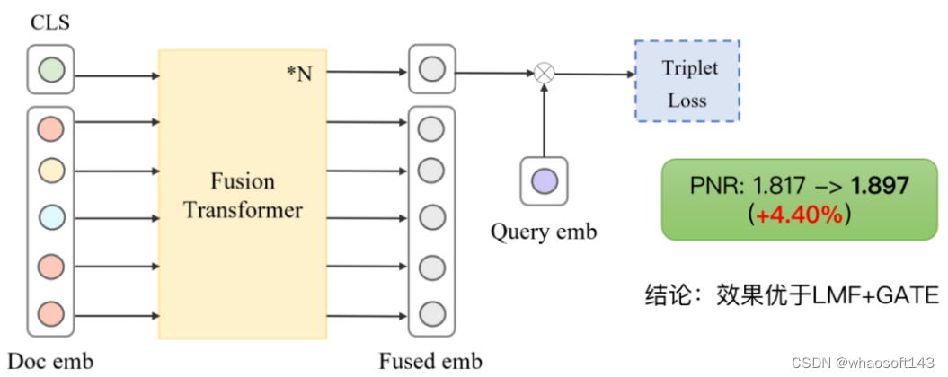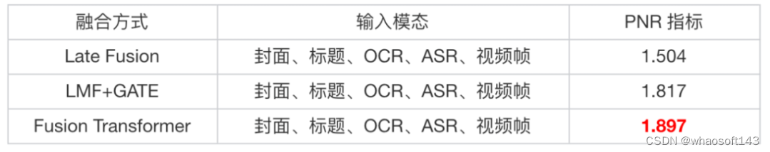 我们在视频内容相关性业务场景,对比了几种常见多模态融合方法的效果,可以发现,基于 Transformer 的融合方法能够取得最佳的效果。 whaosoft aiot http://143ai.com