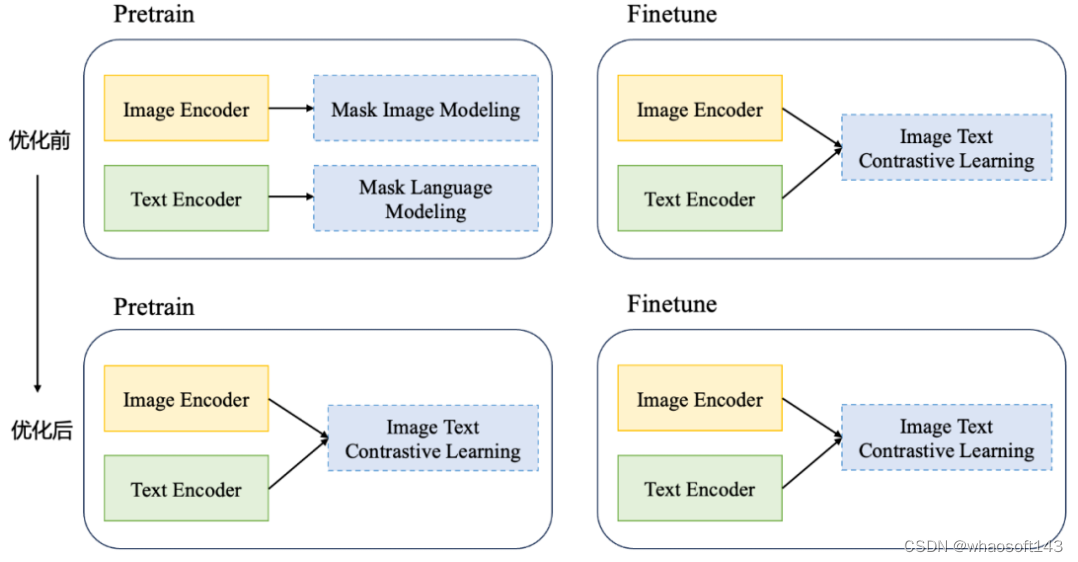 这种方案的问题在于:预训练阶段和最终的应用阶段目标存在 gap,即预训练阶段的目标为模态的表征学习,后续微调阶段为匹配学习。