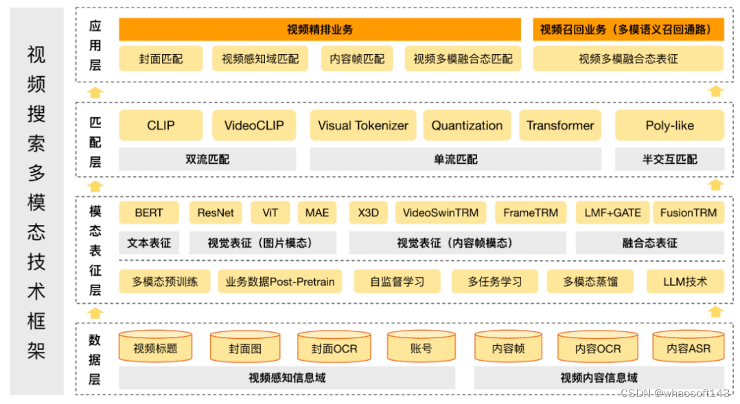 应用层:精排阶段通过构建 query 与封面模态、视频感知模态、内容帧模态和多模融合模态的匹配特征,提升视频搜索效果和用户体验。