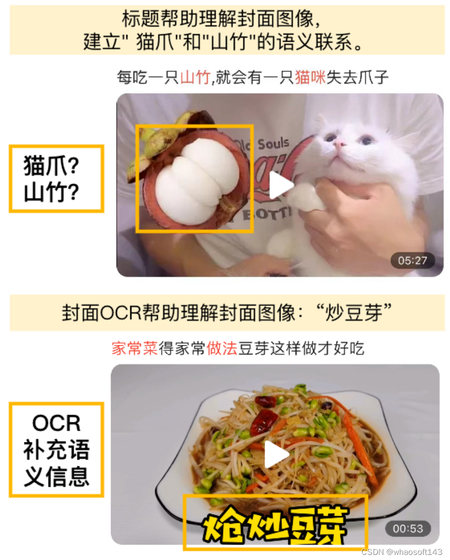 不同于文本网页搜索,视频搜索有其自身独特性:视频封面作为丰富的视觉呈现,对用户有很大的吸引力,同时视频帧也蕴含巨大的信息,并且视频还有封面 OCR 文本、字幕文本等有信息增益的特征(如图 2、3 所示)。最后,视频资源作为众多模态的综合载体,如何把它们进行对齐融合也存在挑战。