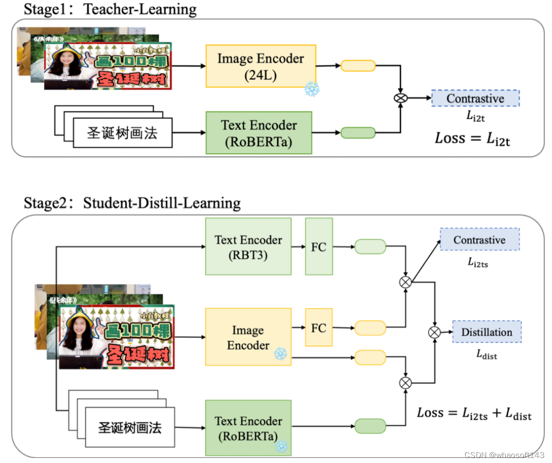 方案一(两阶段训练和蒸馏方案):首先训练大模型,效果收敛后 “冻住” 大模型参数,蒸馏小模型;蒸馏阶段的 Loss 包含与文本小模型和图片表征的对比学习损失和文本表征蒸馏损失。