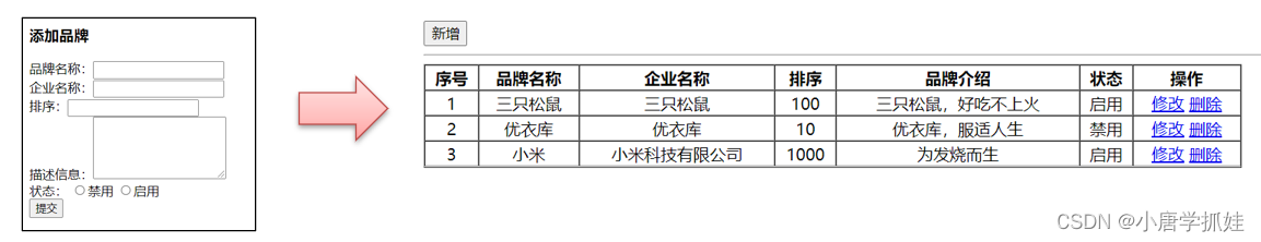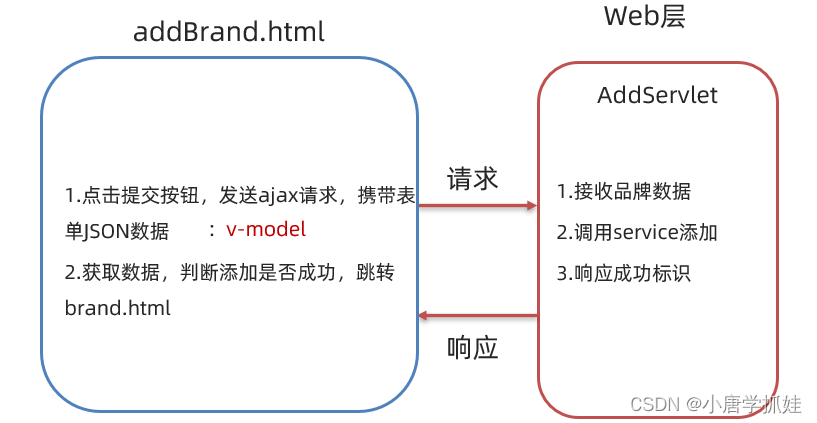 上图左边是页面效果,里面的 提交 按钮可以通过上图右边看出绑定了一个 单击事件,而该事件绑定的是 addBrand 函数,所以添加数据功能的逻辑代码应该写在 addBrand() 函数中。在此方法中需要发送异步请求并将表单中输入的数据作为参数进行传递。如下