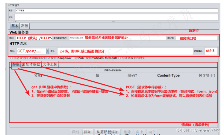 如果大于0,那么如果超过Timeout in milliseconds中设置的最大等待时间后还没达到设置的线程数,Timer将不再等待,释放已到达的线程。:阻塞线程(累积一定的请求),当在规定的时间内达到一定的线程数量,这些线程会在同一个时间点一起释放,瞬间产生很大的压力。案例三:POST请求,URL为https://www.baidu.com/S,请求体为:wd=test(form表单)案例四: