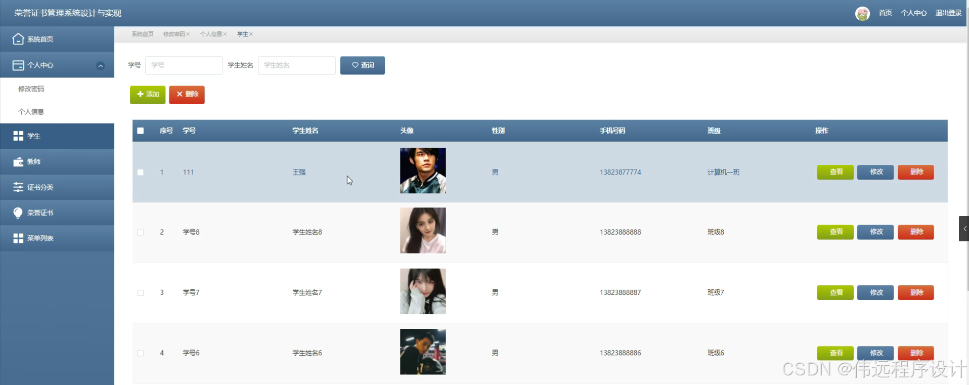 为了解决传统荣誉证书信息管理的问题,本文将设计一个简单,便捷的荣誉证书管理系统,满足用户的需求。本系统分为管理员、学生和教师三大部分,选择了Python语言,并使用了Django框架,这一高级的全能型框架提供了快速开发的可能,同时保证了代码的清晰和高效,对于数据存储和管理,选择了MySQL数据库。前端则采用HTML、CSS、JavaScript和Vue.js进行构建,这些技术使得用户界面的交互性和友好性得到了大大提升。在开发工具上,选择了PyCharm和Navicat,其中PyCharm是一款优秀的Python集成开发环境,功能强大且使用方便;Navicat则为数据库管理提供了良好的支持。利用这些技术结合实际需求开发了具有系统首页、个人中心、学生、教师、证书分类、荣誉证书、菜单列表等功能的系统。
