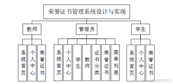 荣誉证书管理系统分管理员、学生和教师三大部分。系统按照用户的实际需求开发而来,贴近生活。从管理员出拿到分配好的账号密码可以进入系统,使用相关的系统应用。管理员总体负责整体系统的运行维护,统筹协调。系统整体功能展示如图4-1所示。