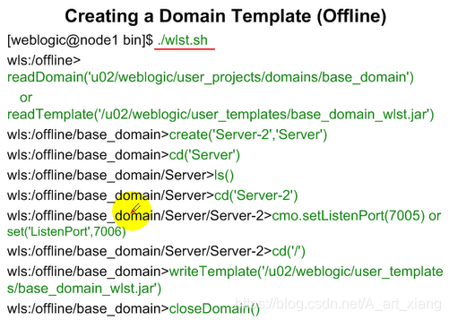1.读取domain:readDomain('/home/weblogic/Oracle/Middleware/user_projects/domains/base_domain')