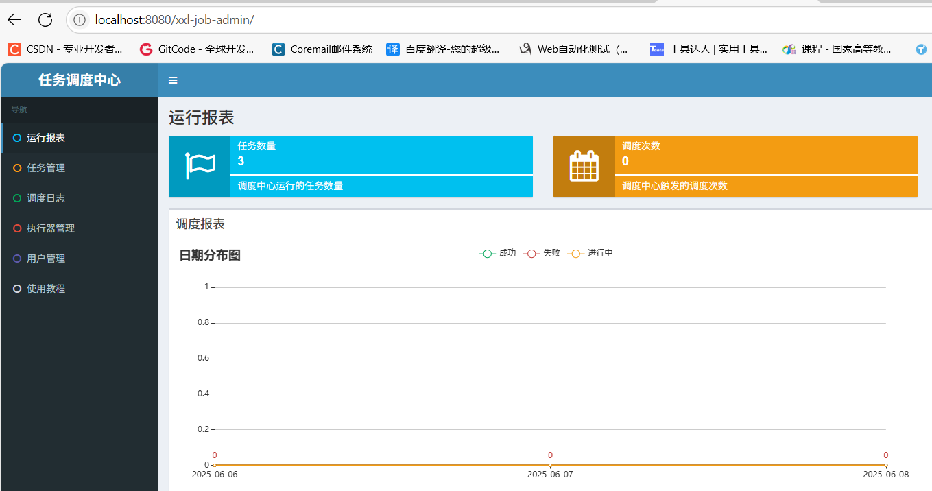 调度中心访问地址:http://localhost:8080/xxl-job-admin (该地址执行器将会使用到,作为回调地址)