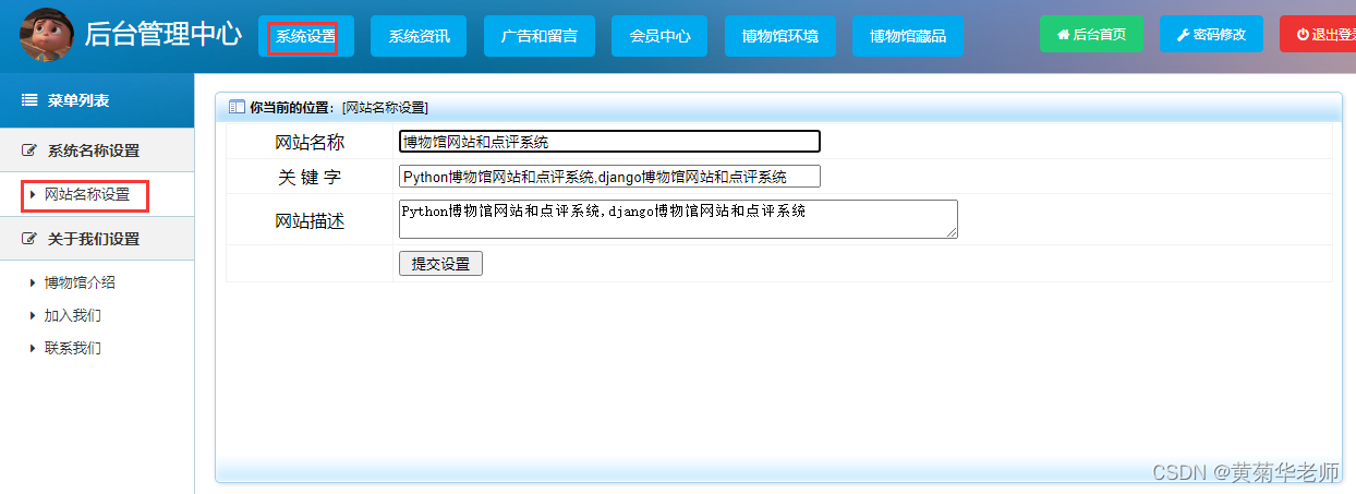 本课题主要目标是设计并能够实现一个基于Python技术的博物网站网站系统,整个网站项目使用了B/S架构,基于python的Django框架下开发;管理员通过后台设置网站名称、关于我们、录入系统公告帮助信息、设置轮播图、留言管理、会员管理、录入博物馆环境图片、录入和管理博物馆藏品信息等;用户浏览网站、注册登录、查看系统公告和帮助信息、查看博物馆环境展示图片、查看博物馆藏品展示、对博物馆环境和博物馆现
