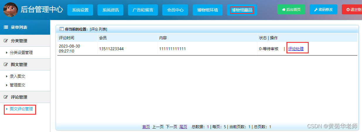 博物馆藏品评论管理:支持对评论信息审核,删除;审核后的信息用户才可见