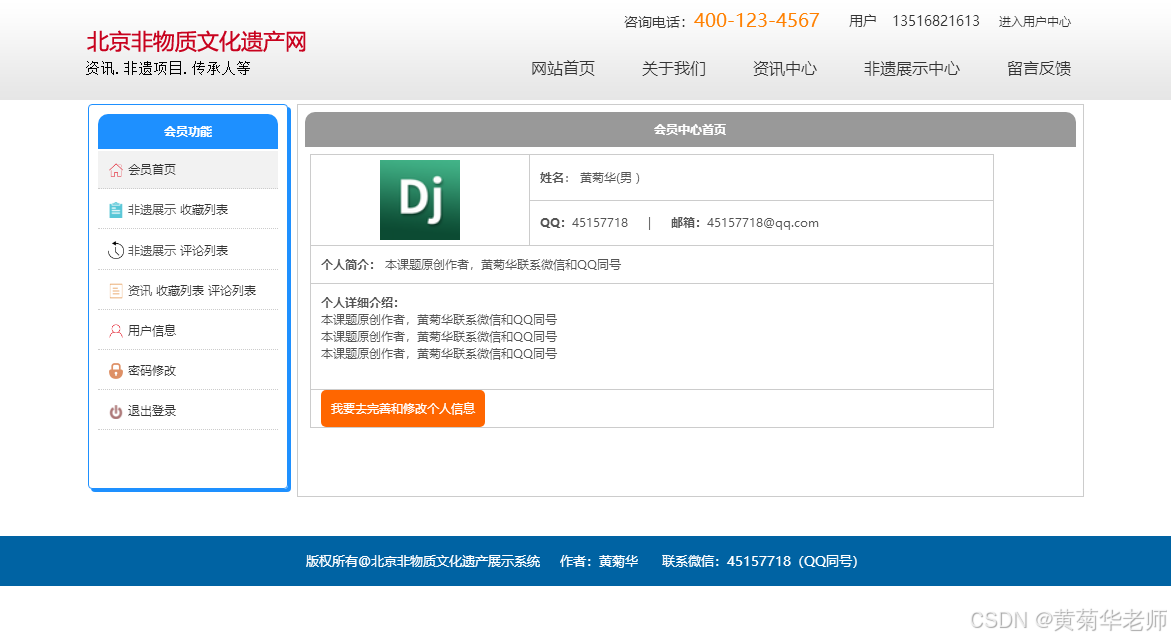 黄菊华老师《Vue.js入门与商城开发实战》《微信小程序商城开发》图书作者,CSDN博客专家,在线教育专家,CSDN钻石讲师;专注大学生毕业设计教育和辅导。所有项目都配有从入门到精通的基础知识视频课程,学习后应对毕业设计答辩。项目配有对应开发文档、开题报告、任务书、PPT、论文模版等项目都录了发布和功能操作演示视频;项目的界面和功能都可以定制,包安装运行!!!如果需要联系我,可以在CSDN网站查询