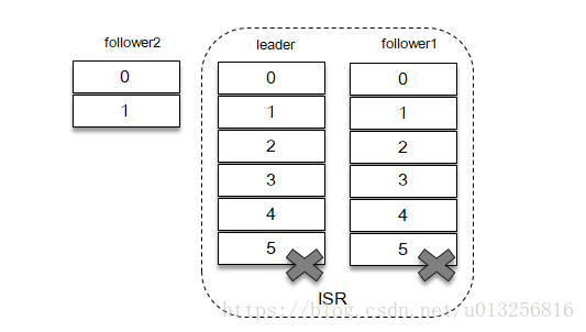 如上图所示,新的follower副本需要删除消息4和消息5,之后才能与新的leader副本进行同步。之后新的follower副本和新的leader副本组成了新的ISR集合,参考下图。